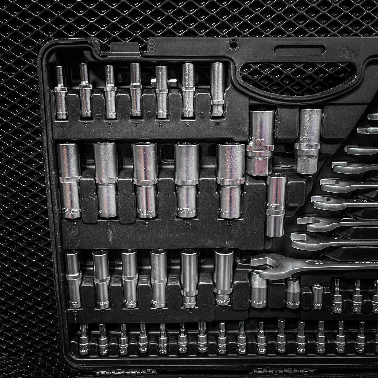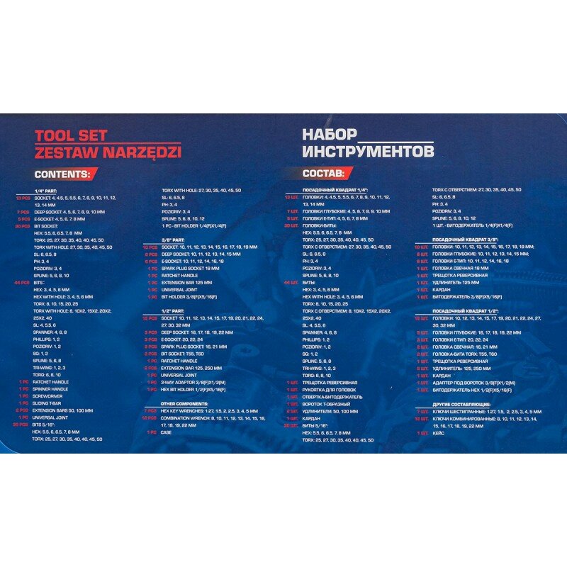 | Головки торцевые подробно | 1/2": 10, 11, 12, 13, 14, 15, 17, 19, 20, 21, 22, 24, 27, 30, 32 мм; 1/2": E20, E22, E24; Т-образный вороток: 1/2", 1/4"; кардан: 1/2", 3/8", 1/4"; трещотка: 1/2", 3/8", 1/4"; 1/2": удлинители 125, 250 мм; 1/2": свечные головки 16, 21 мм; 1/4": 4, 4.5, 5, 5.5, 6, 7, 8, 9, 10, 11, 12, 13, 14 мм; 1/4": E4, E5, E6, E7, E8; 1/4": удлинители 50, 100 мм; 1/4": отвертка под биты; 3/8": 10, 11, 12, 13, 14, 15, 16, 17, 18, 19 мм; 3/8": E10, E11, E12, E14, E16, E18; 3/8": головки свечные 18 мм |