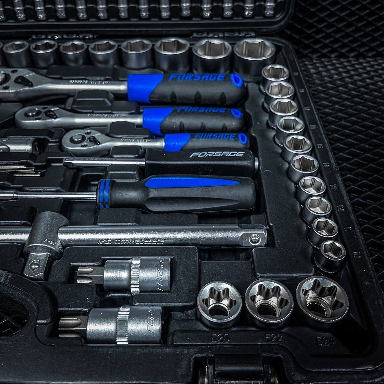 Набор инструментов Forsage 38841, 216 предм, черный 1/4", 3/8", 1/2" трещетка с силовым механизмом
