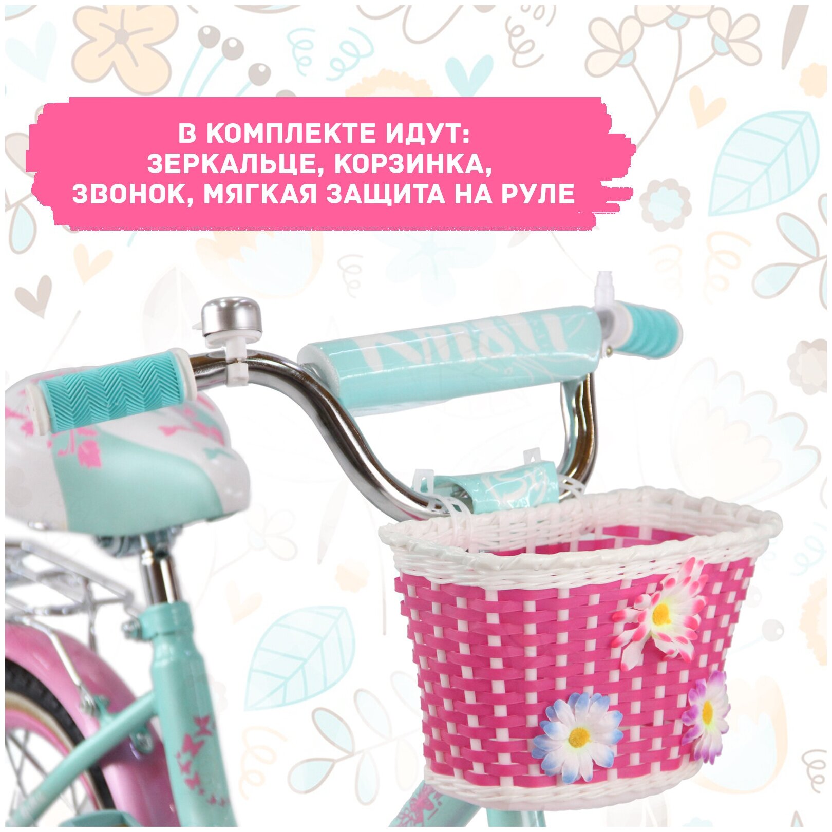 | В комплекте | багажник, боковые колеса, защита цепи, защитная накладка на руле, звонок, корзина на руле, крылья, мягкая накладка на руль |