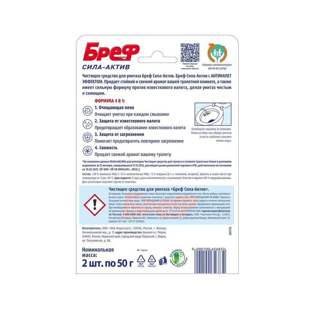 Гигиенический блок для унитаза Bref "Сила-Актив. Лимонная свежесть", 2x50г, блистер (9000100656832)