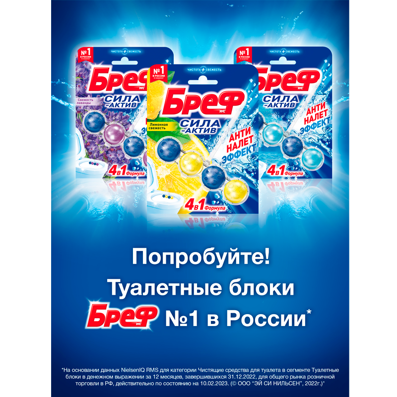 Блок для чистки и свежести унитаза 4 в 1 Bref Сила актив «Свежесть лаванды», 3 x 50 г