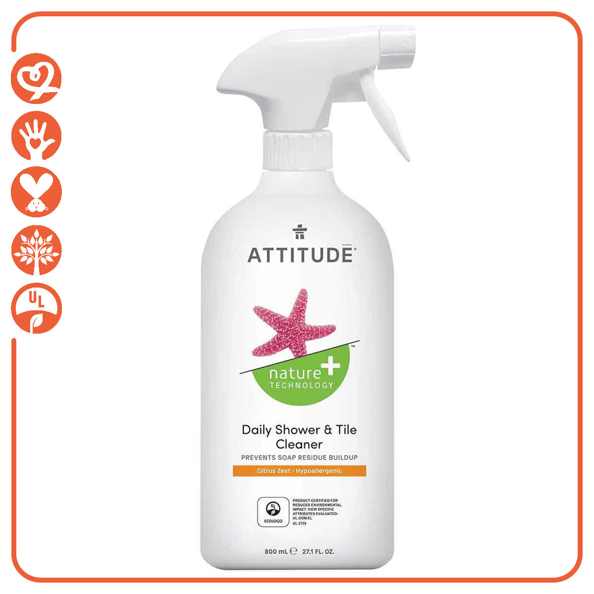 Спрей Attitude для ежедневного ухода за плиткой и душевой кабиной, гипоаллергенный, экологичный, Цитрус, 0.8 л (Канада)