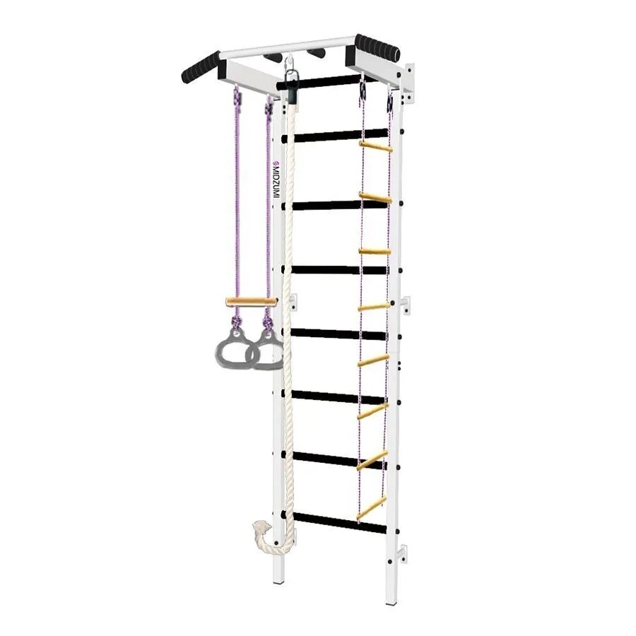 | Подробная комплектация | шведская стенка, турник стационарный не регулируемый по высоте, кольцо для груши или каната, веревочная лестница, кольца с перекладиной, канат, рукоятки для параллельного хвата, крепёж (6 опорных точек, 6 креплений к стене), крепления к стене, мягкие неопреновые ручки, инструкция по сборке |