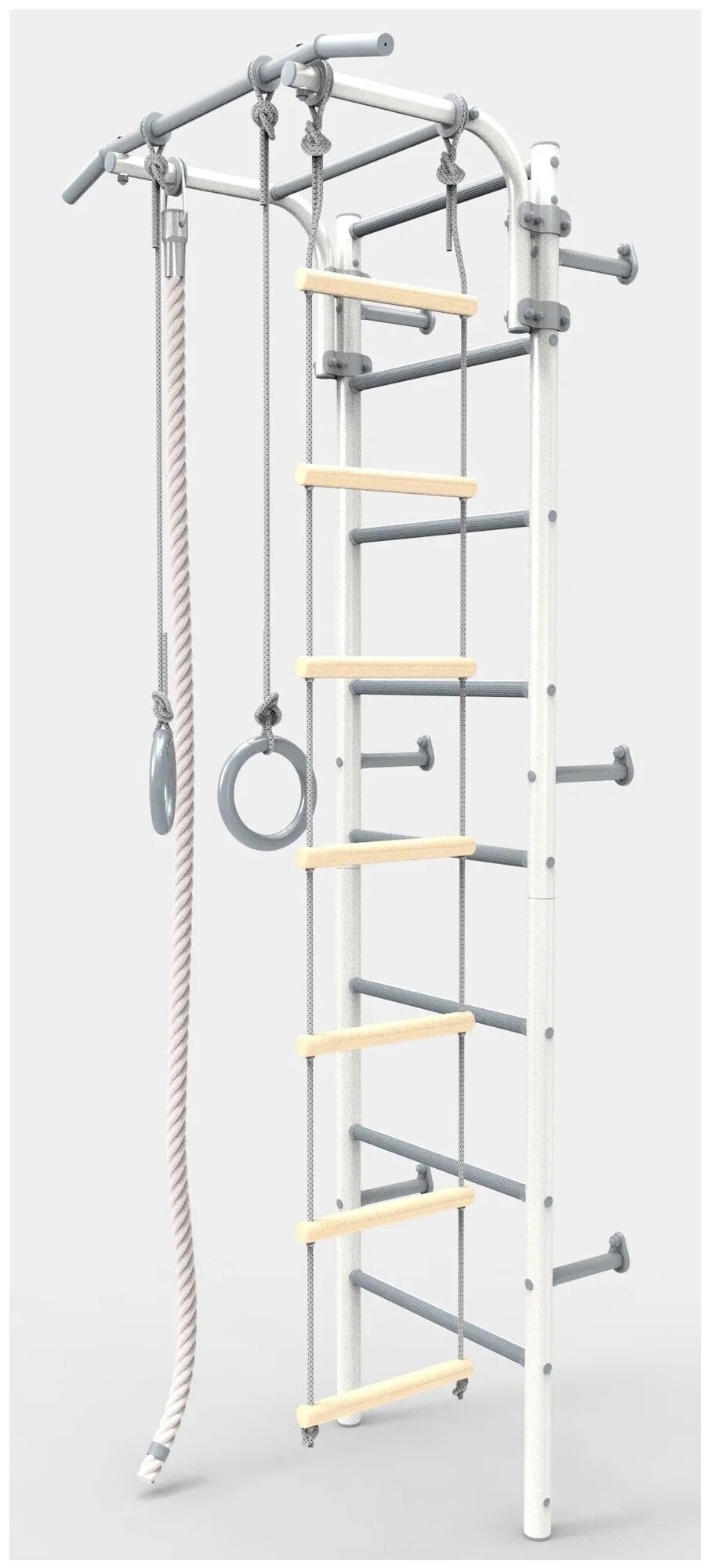 Шведская стенка с подвижным турником (кольца гимнастические , канат , лестница веревочная) бело-серый