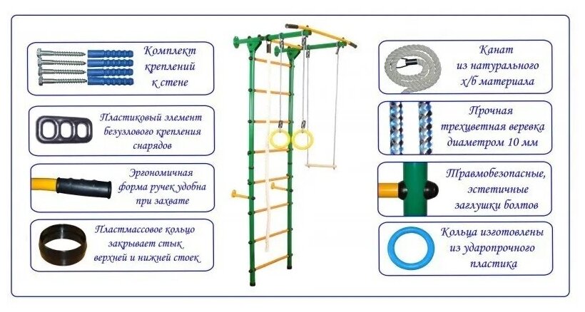 | Подробная комплектация | шведская стенка, турник с широким хватом, кольца гимнастические с присоблением для удобной регулировки высоты установки, трапеция, канат, крепеж. |