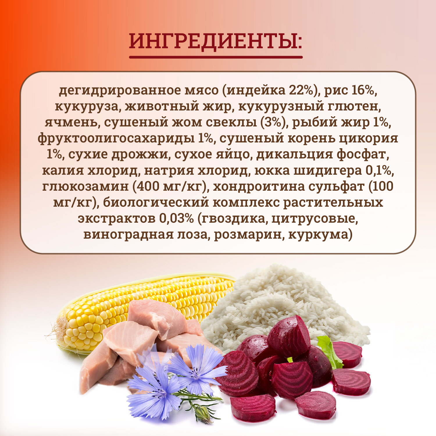 | Состав | дегидрированное мясо (индейка 22%), рис 16%, кукуруза, животный жир, кукурузный глютен, ячмень, сушеный жом свеклы (3%), рыбий жир 1%, фруктоолигосахариды 1%, сушеный корень цикория 1%, сухие дрожжи, сухое яйцо, дикальция фосфат, калия хлорид, натрия хлорид, юкка шидигера 0,1%, глюкозамин (400 мг/кг), хондроитина сульфат (100 мг/кг), биологический комплекс растительных экстрактов 0.03% (гвоздика, цитрусовые, виноградная лоза, розмарин, куркума) |