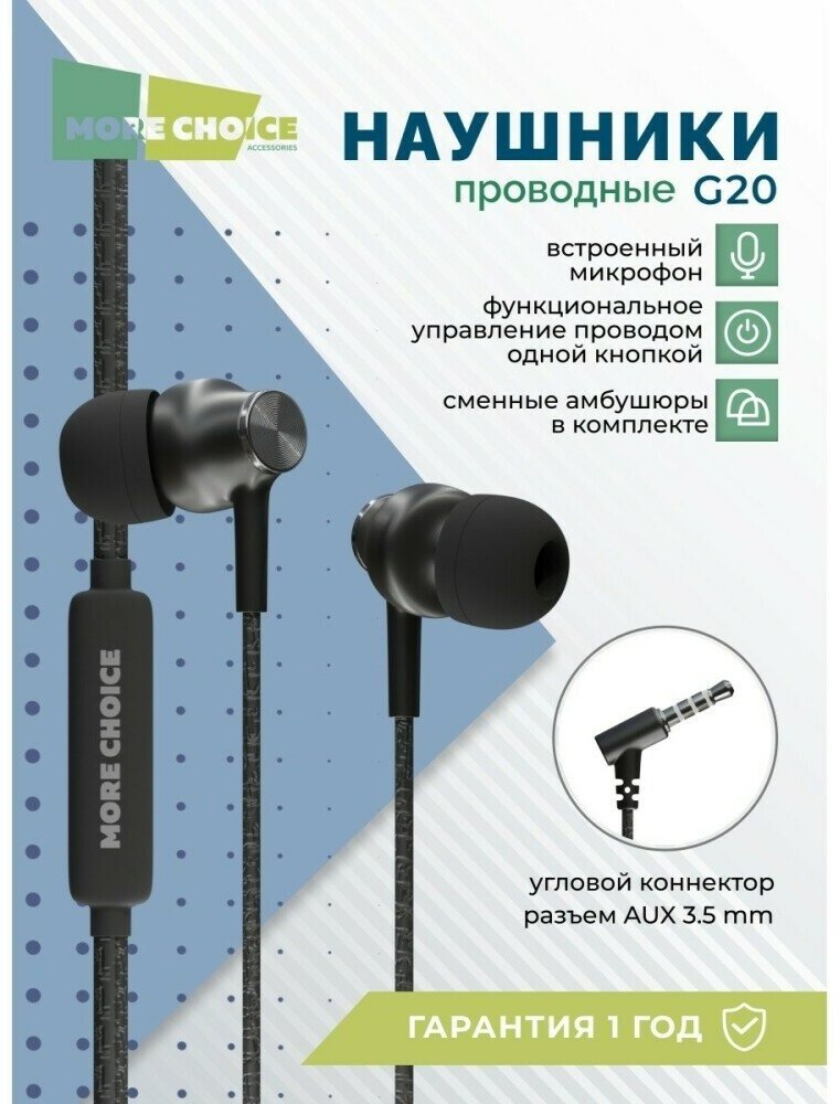 Наушники MORE CHOICE 4627151195766 G20 проводные, вакуумные, черный