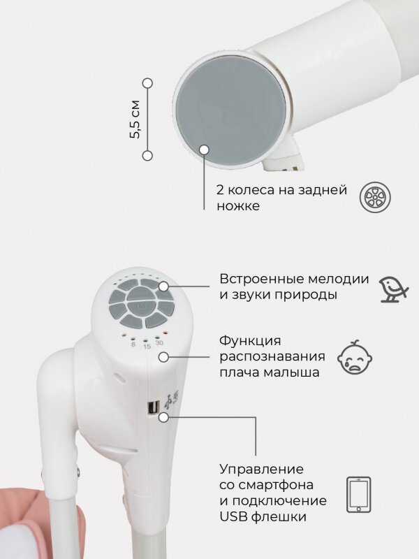 Надёжный металлический каркас. Возможность передвигать по квартире не поднимая (колеса в задней стойке) Подключение любой музыки через телефон или с флешки. Автоматическое укачивание. |