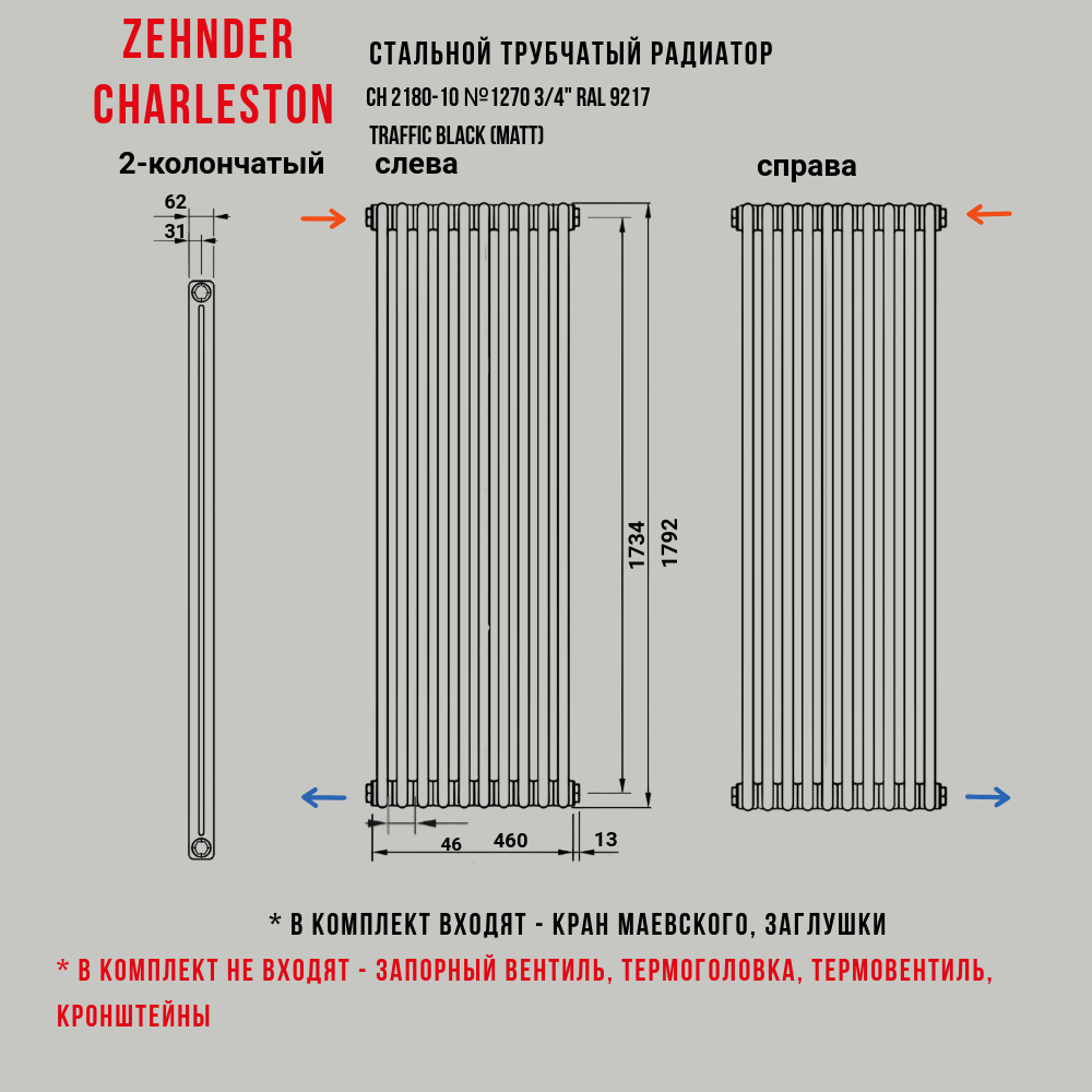 СохранитьРадиатор труб. Zehnder Charleston 2180, 10 сек.1/2 бок.подк. RAL9005matt (9205) (кроншт.в компл) интересное:
