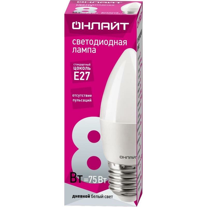 Светодиодная лампа свеча онлайт 61 130 OLL-C37-8-230-6.5K-E27-FR, цена за 1 шт.