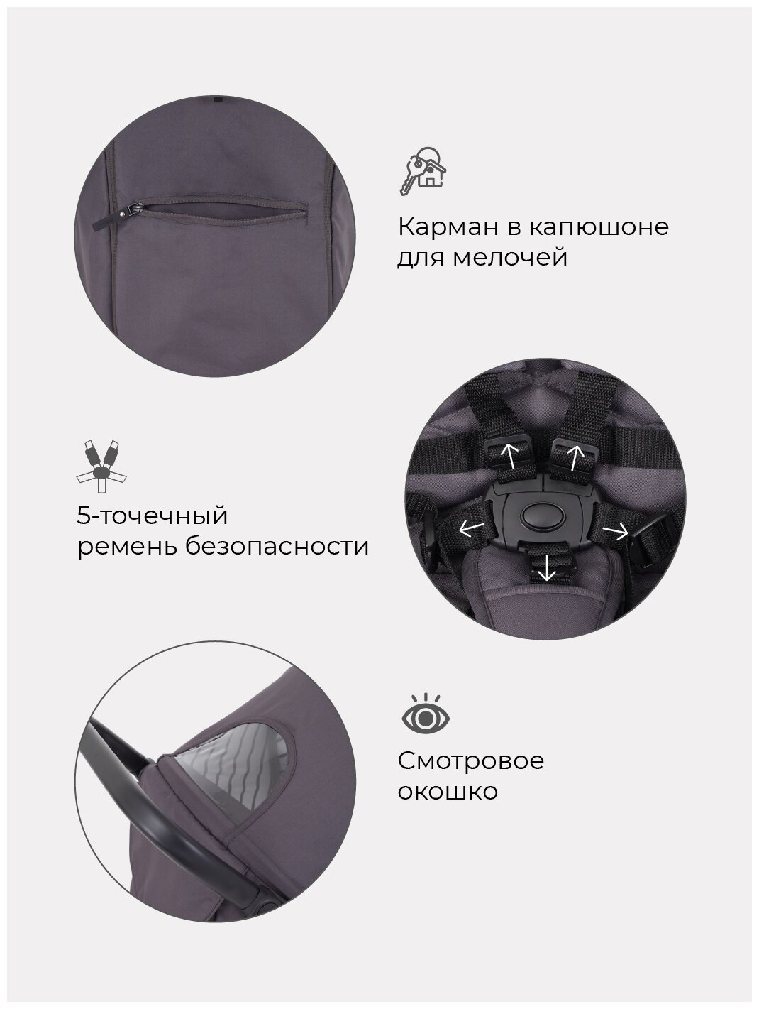 | Плюсы: | Капюшон большой, хорошо укрывает ребенка. Компактно складывается. |