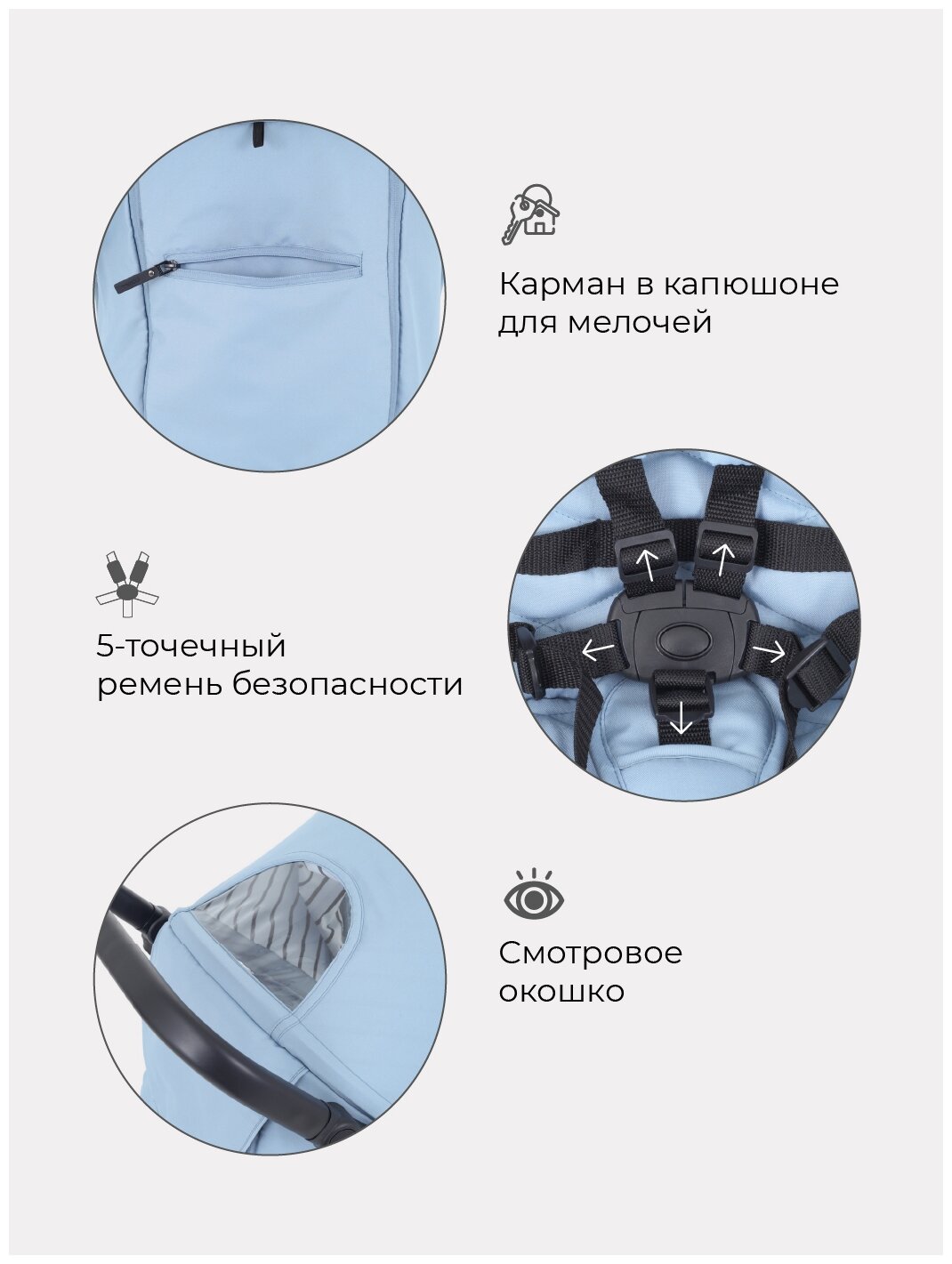 | Плюсы: | Капюшон большой, хорошо укрывает ребенка. Компактно складывается. |