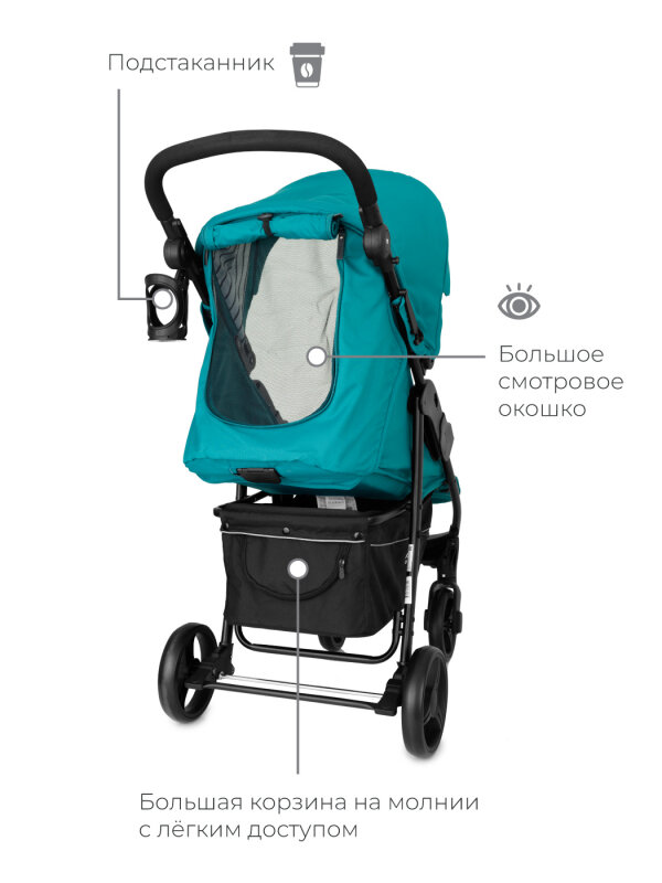 Лёгкая; Маневренная в поворотах; Большой козырёк; Можно достать из корзины вещи через дополнительное окно даже в положении лёжа. |