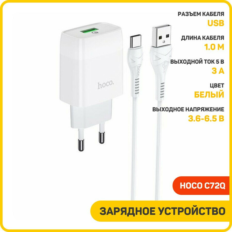 Зарядное устройство Hoco C72Q, белый (QC3.0, 1xUSB, 3A, кабель Type-C)