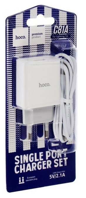 Купить Hoco Сетевое зарядное устройство Hoco C81A, USB - 2.1 А, кабель Lightning 1 м, белый