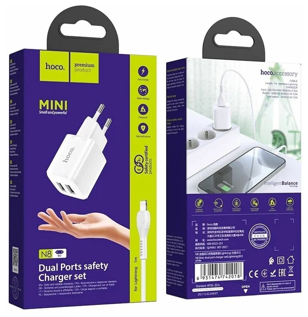 СЗУ, 2 USB 2.4A 12W (N8), HOCO, Lightning, Умная зарядка, белый