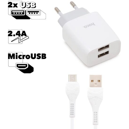 Купить Сетевое зарядное устройство Hoco C73A Glorious 2xUSB, 2.4А + USB кабель MicroUSB, 1м, белый