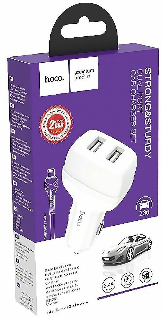 Автомобильное зарядное устройство HOCO Z36 Leader с кабелем USB-Lightning, белый интересное: