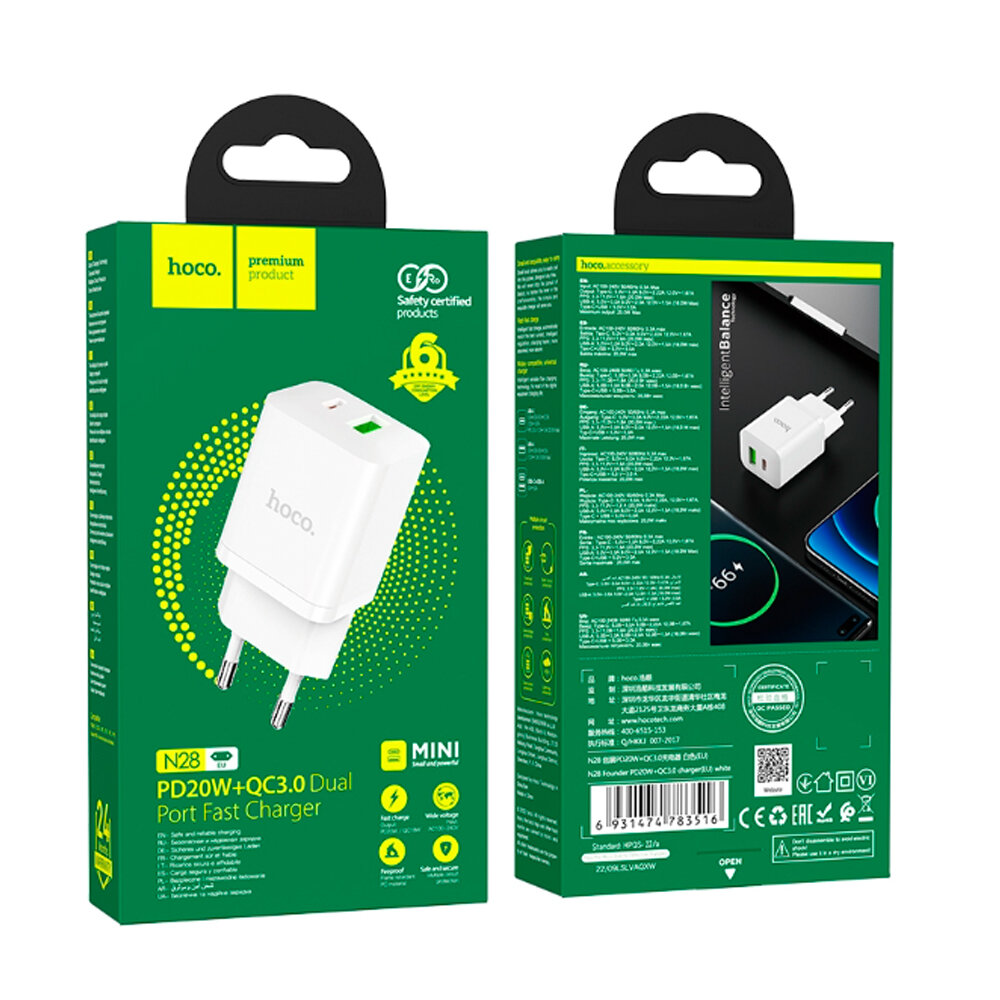 Сетевое зарядное устройство HOCO N28 USB-A, USB-C, 20W "быстрая зарядка", белый