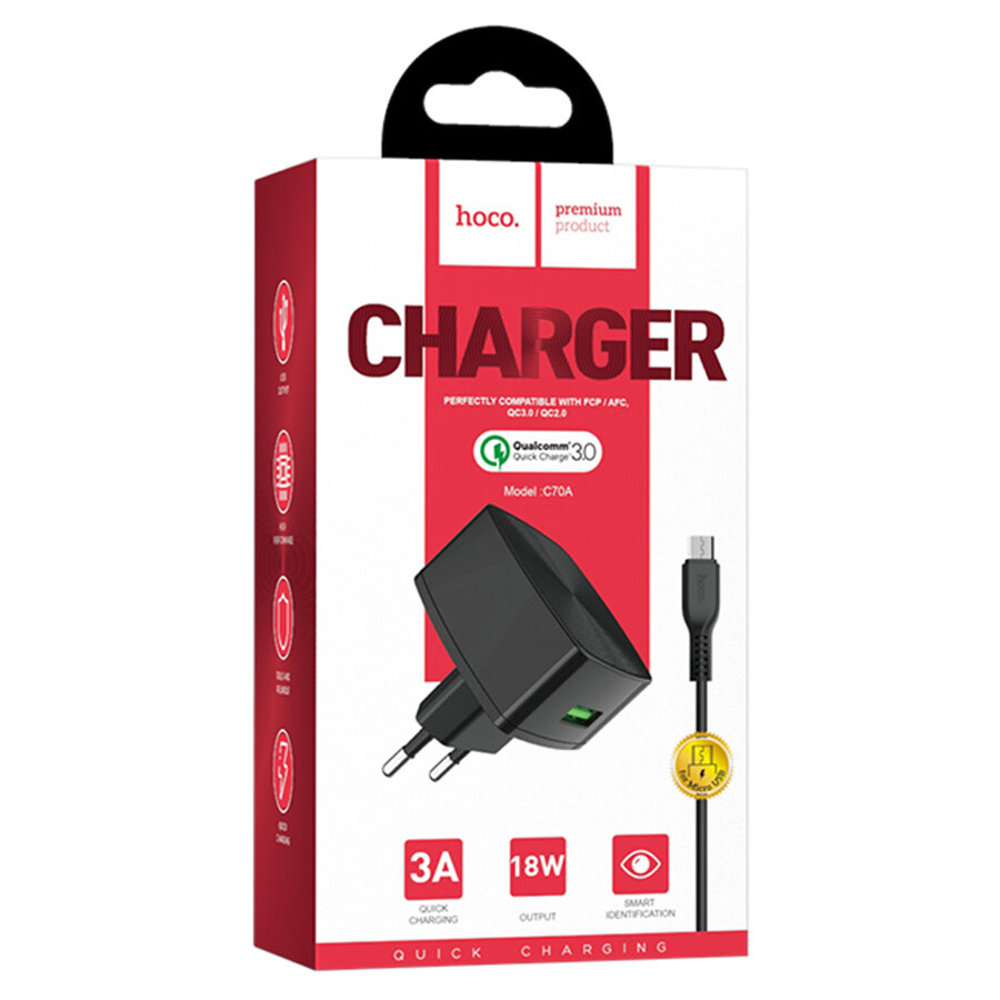 Сетевое зарядное устройство, 1 USB 3.0A (C70A), QC3.0, HOCO, Micro, черный