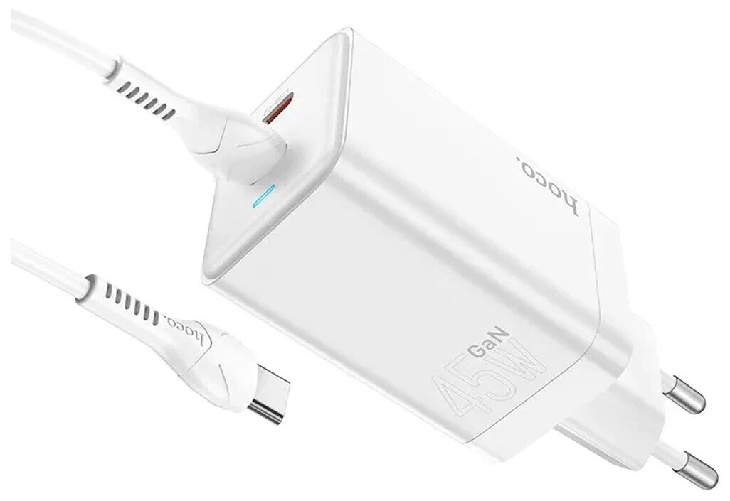 Купить Сетевое зарядное устройство c 2 Type-C HOCO N23 GAN, кабель Type-C to iPhone, (Type-C1 PD, Type-C2 PD, ) max 45W, белое