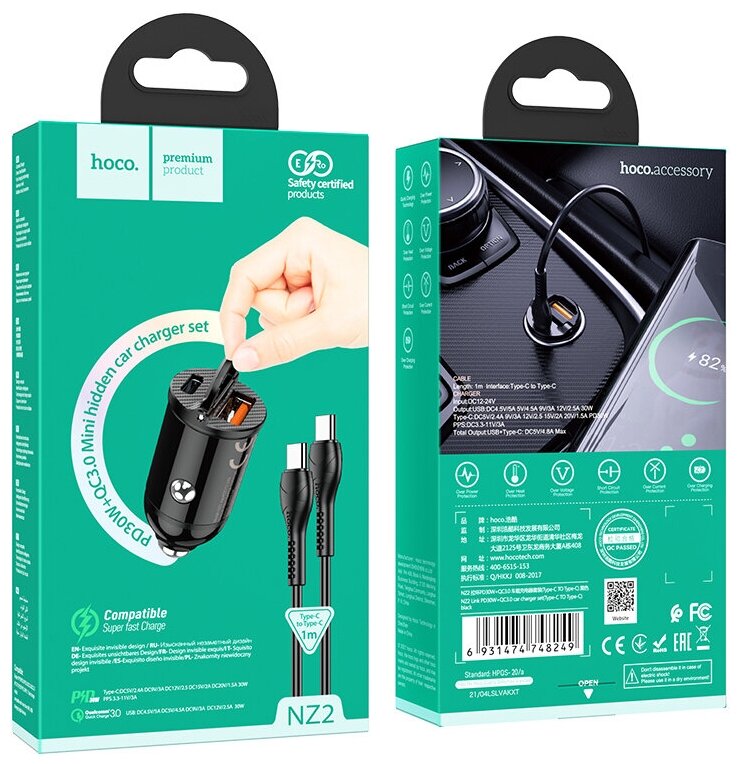 Автомобильное зарядное устройство HOCO NZ2 30W + кабель Type-C "быстрая зарядка", черный