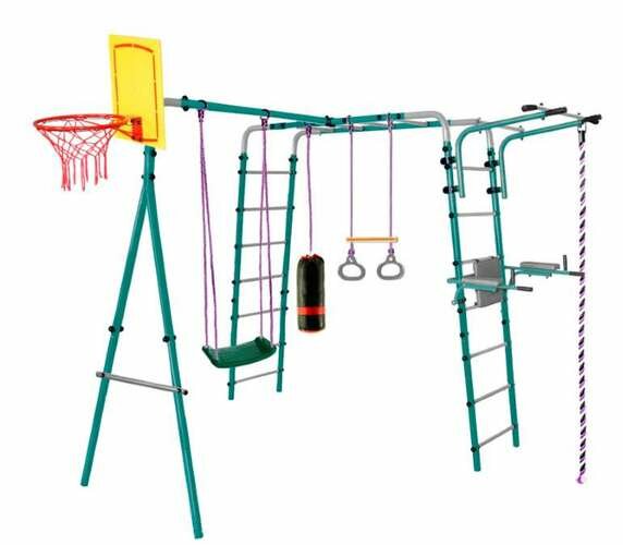 | Комплектация | каркас из металлических лестниц с рукоходом, передвижной турник, баскетбольный щит, брусья откидные со спинкой, подвесные пластиковые качели, канат, кольца с перекладиной, набор боксерский мешок-груша |