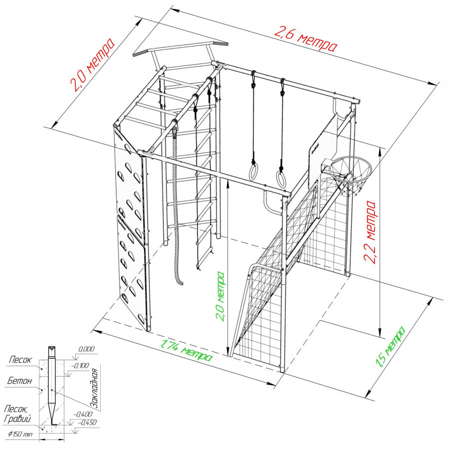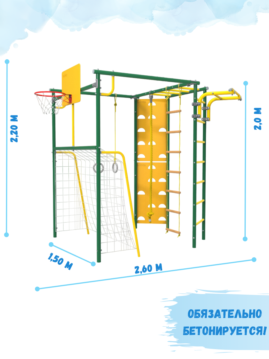 | В комплекте | баскетбольное кольцо, веревочная лестница, ворота, гимнастические кольца, канат, рукоход, скалолазная стенка, турник |