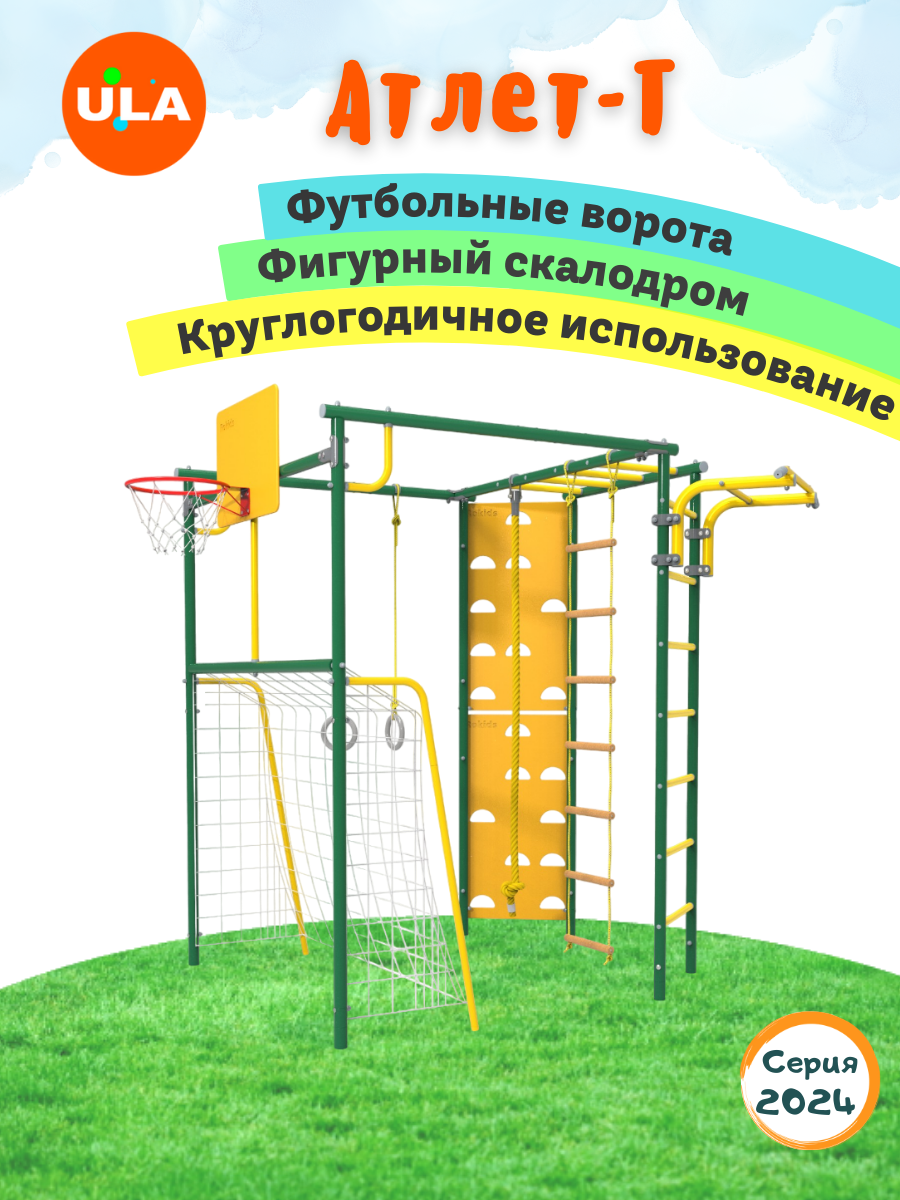 Спортивный комплекс детский уличный Атлет-Т / ворота, скалодром, рукоход, веревочная лестница, баскетбольное кольцо / зеленый