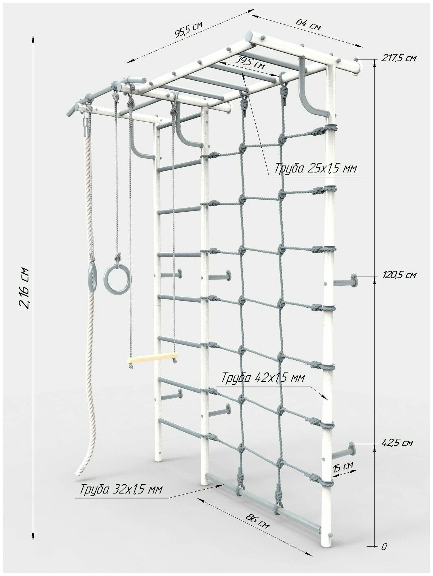 | В комплекте | гимнастические кольца, канат, лестница, рукоход, сетка для лазания, трапеция |