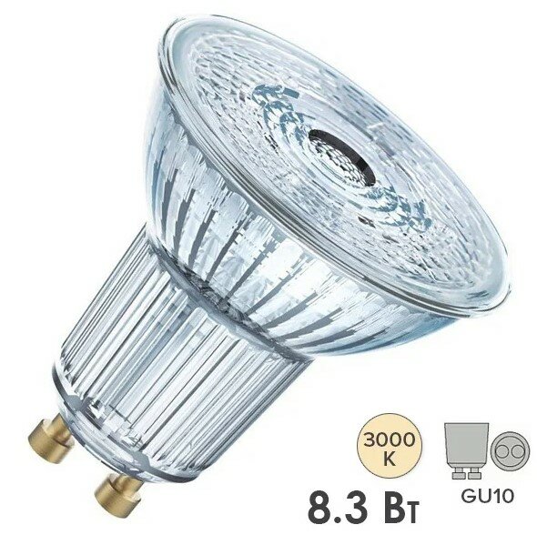 Лампа Светодиодная OSRAM 8.3W=80W 220V Софит PARATHOM GU10 PAR16 575Лм Диммируемая угол 36° 3000К Ra≥90 Теплый белый свет, уп. 5шт