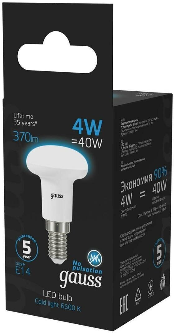 Лампа GAUSS R39 4W 370lm 6500K Е14 LED 1/10/100 106001304