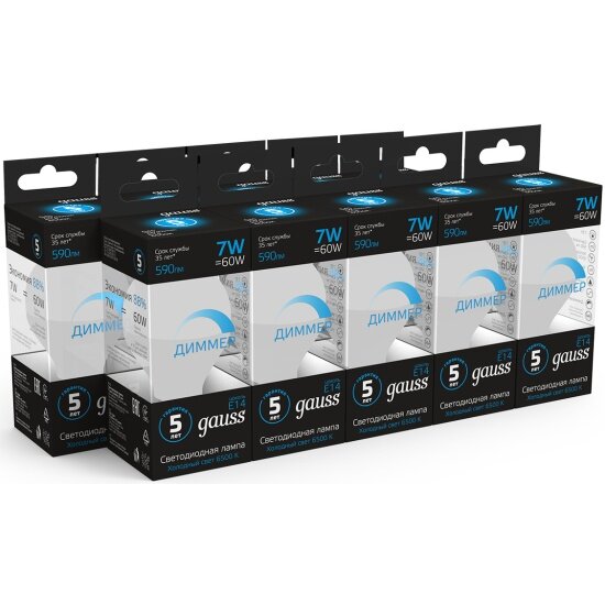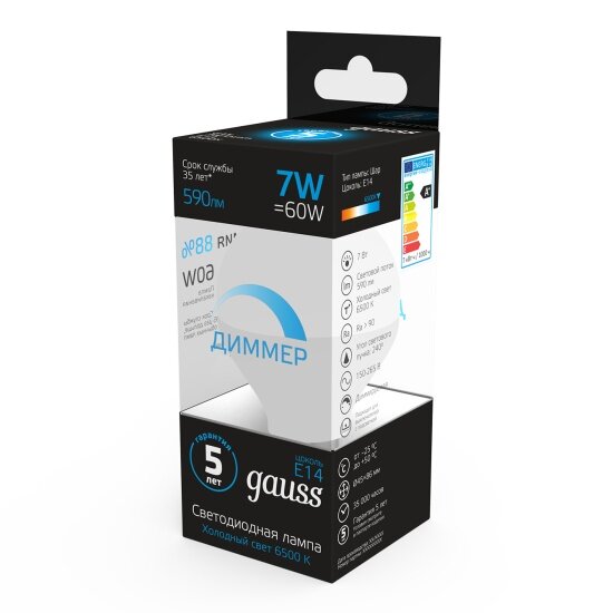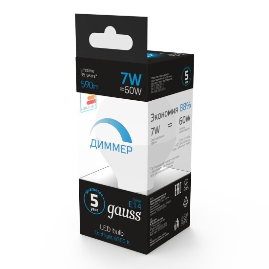 Светодиодная лампа Gauss Шар 7W 590lm 6500К E14 диммируемая LED 1/10/100 интересное: