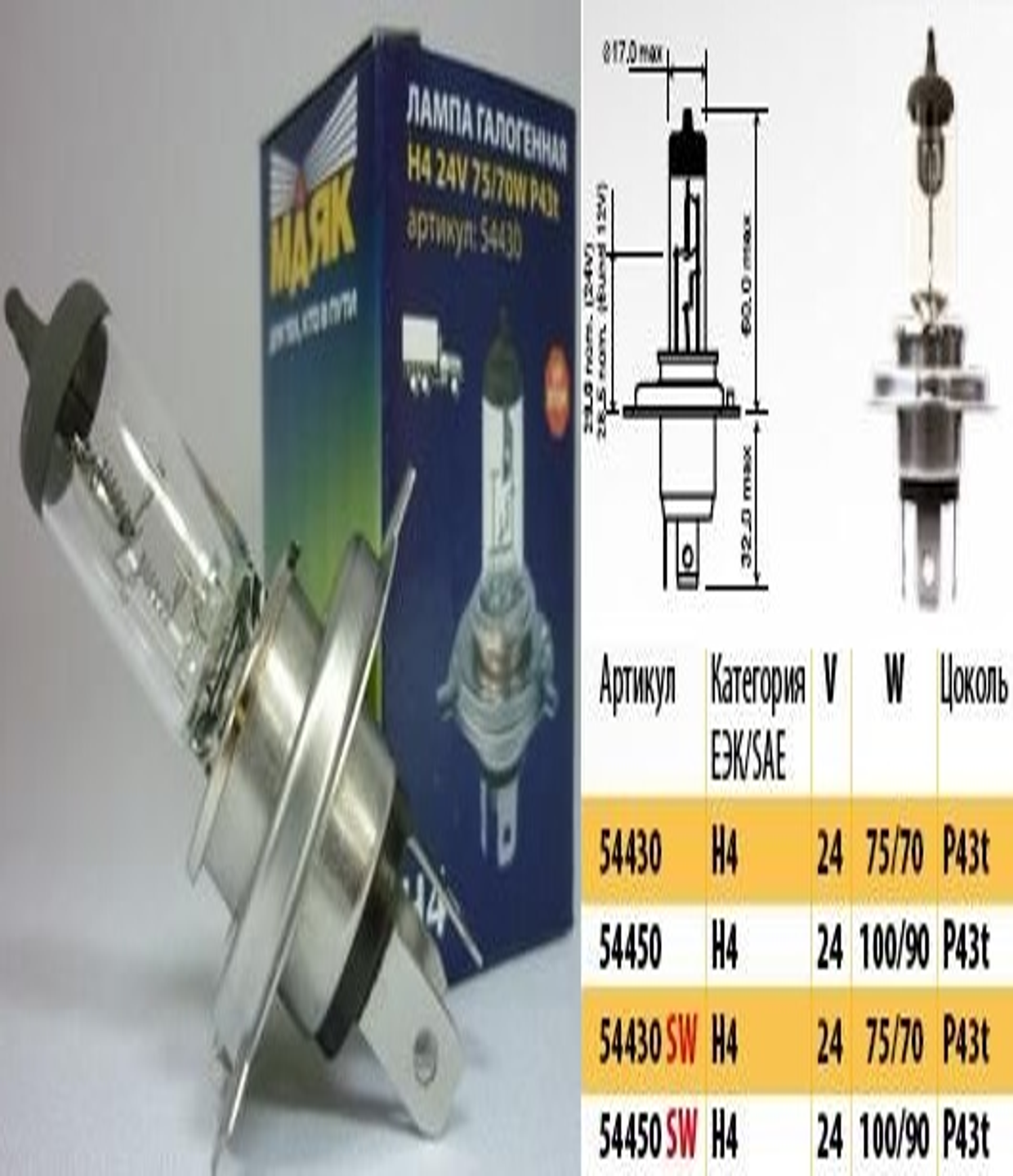Лампа H4 24v 75/70вт Маяк 54430 * Маяк арт. 54430