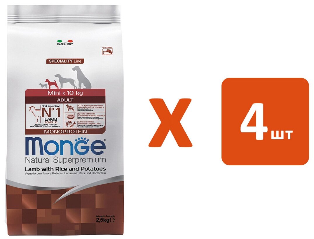 MONGE SPECIALITY DOG MINI ADULT LAMB для взрослых собак маленьких пород с ягненком, рисом и картофелем (2,5 кг х 4 шт) интересное: