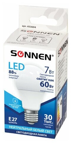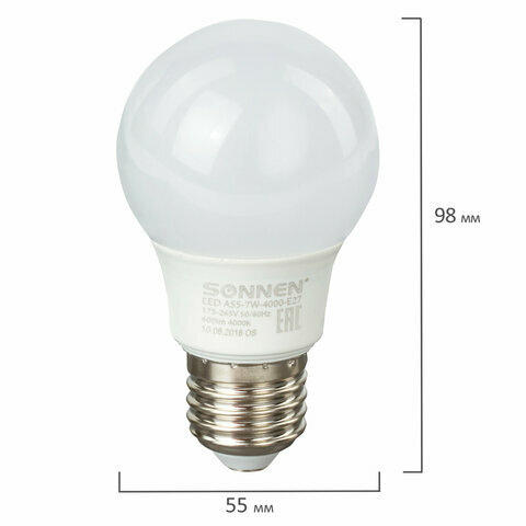 Лампа светодиодная SONNEN, 7 (60) Вт, цоколь Е27, груша, нейтральный белый свет, 30000 ч, LED A55-7W-4000-E27, 453694 (цена за 1 ед.товара)