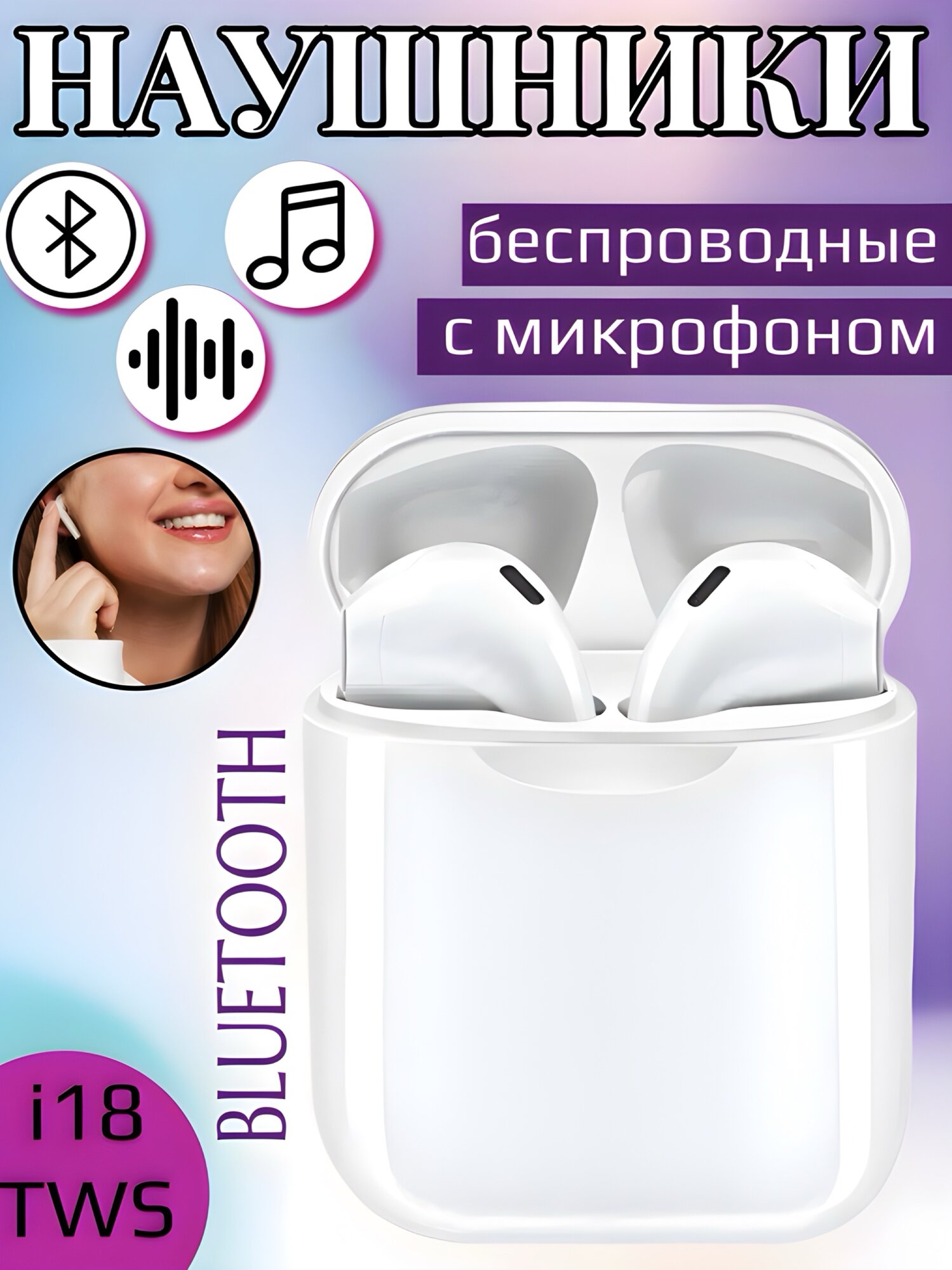 Беспроводные наушники-гарнитура i18 TWS с микрофоном для смартфона, белые интересное: