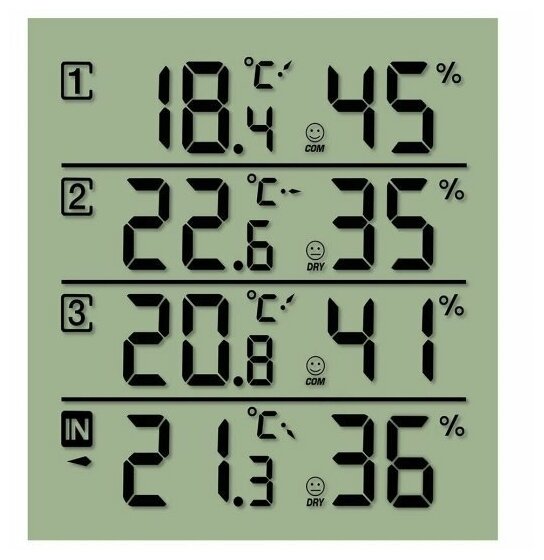 2. Все работают на батарейках ААА. 3. Большой дисплей на главном устройстве. 4. На каждом датчике есть экран с показаниями влажности и температуры. |