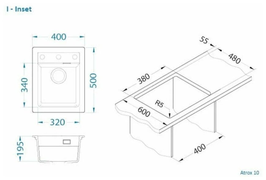 Каменная мойка для кухни врезная под / на столешницу ALVEUS GRANITAL ATROX 10 400 X 500 искусственный камень гранит с сифоном
