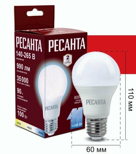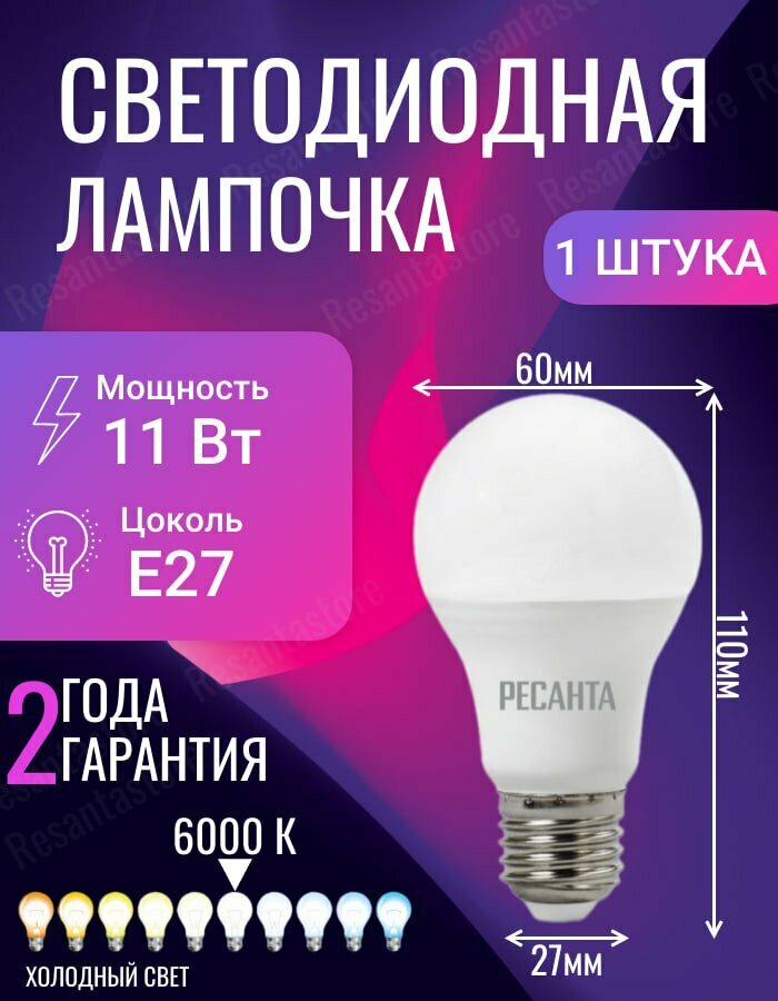 Лампа светодиодная LL-R-A60-11W-230-6K-E27 (груша, 11Вт, холод., Е27) Ресанта интересное: