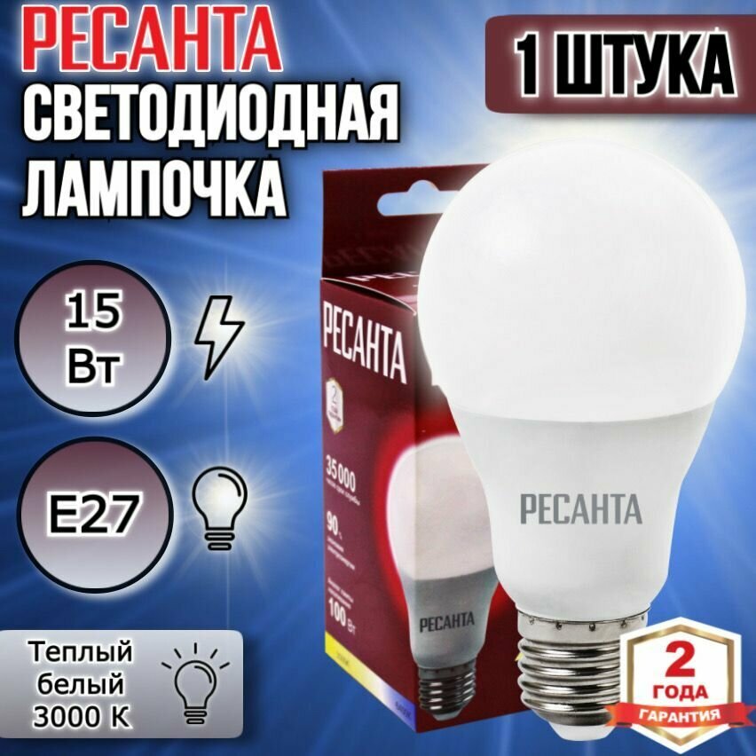 Лампа светодиодная РЕСАНТА 76/1/19, E27, A65, 15Вт, 3000 К