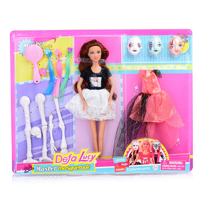 | Комплектация | - кукла; - 3 цветные пряди на заколках; - 3 маски; - нарядное платье; - расчёска; - резинки; - 5 предметов для костюмированной вечеринки. |