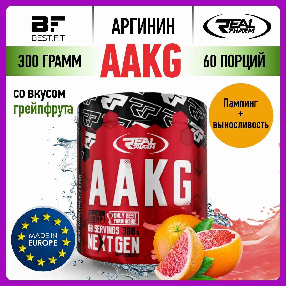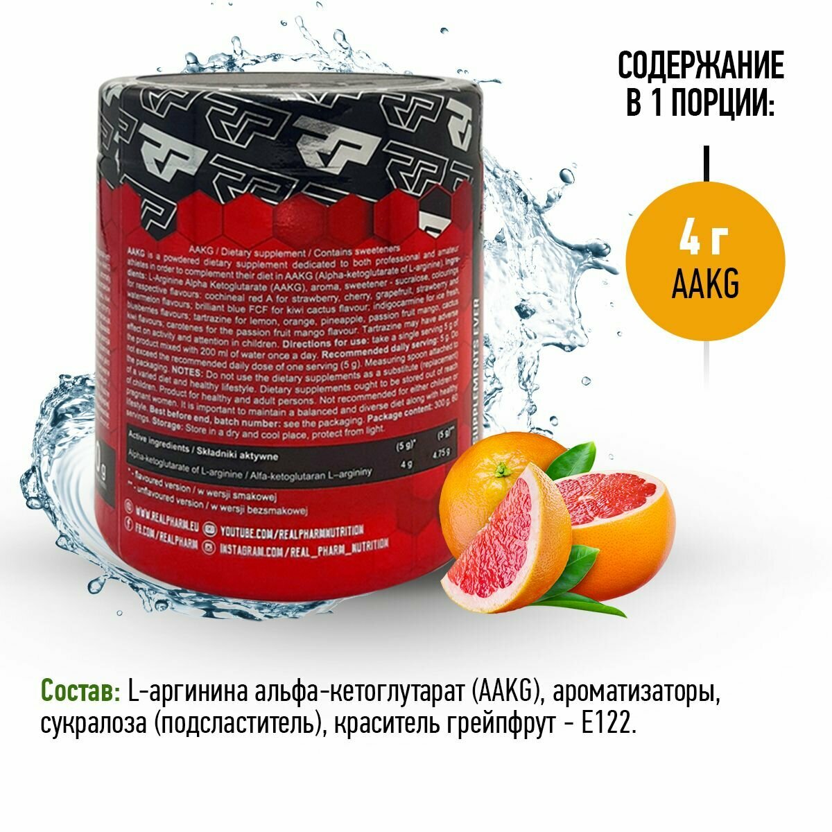 Аминокислота L-Аргинин Real Pharm AAKG, 300г (Грейпфрут) / Для волос, потенции, спорта интересное: