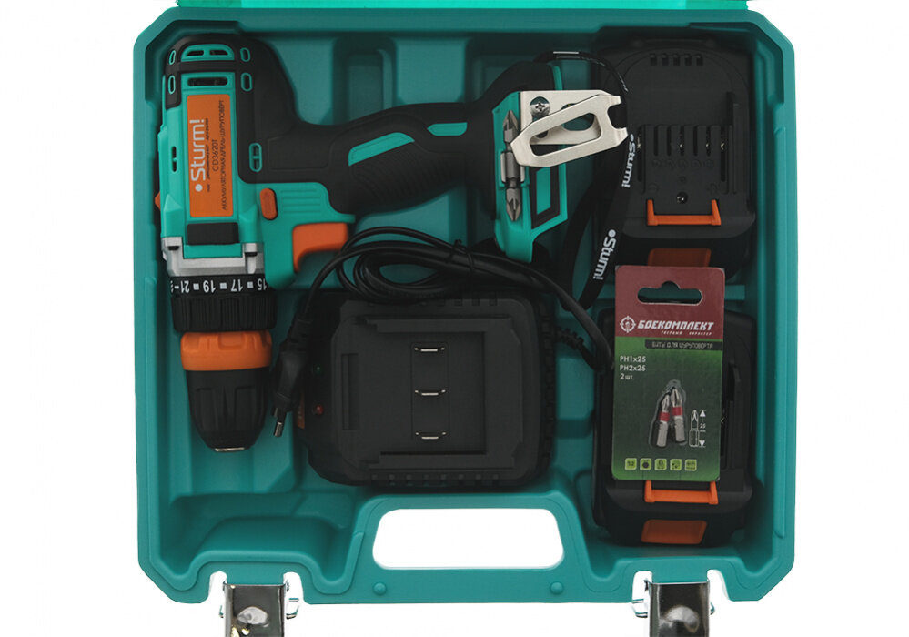 | Подробная комплектация | дрель-шуруповерт, аккумулятор - 2 шт., зарядное устройство, двусторонняя бита - 2 шт., кейс |