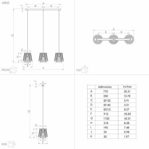 43853 Подвесной потолочный светильник (люстра) HYKEHAM, 3Х40W, E27, L910, B210, H1100, сталь, черный/дерево, натуральный