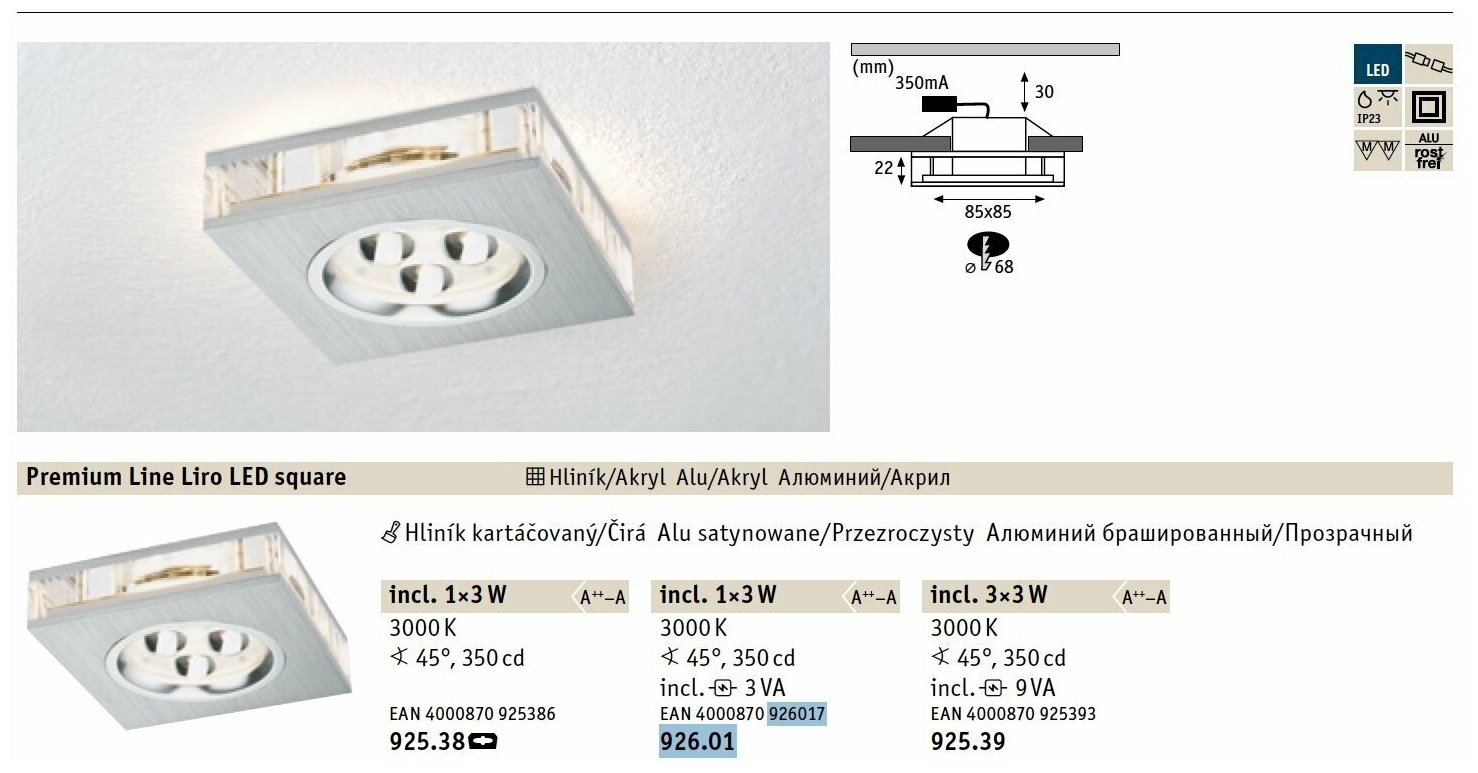 Ниже Вы можете прочитать отзывы на Светильник встраиваемый Paulmann Premium Line Liro LED squarem 3Вт 3000К IP23 Вкл. трансформатор 350мА Алюминий тертый/Прозрачный Алюминий/Акрил 92601, ознакомится с подробными характеристиками, посмотреть интересные обзоры и фотографии на Светильник встраиваемый Paulmann Premium Line Liro LED squarem 3Вт 3000К IP23 Вкл. трансформатор 350мА Алюминий тертый/Прозрачный Алюминий/Акрил 92601.