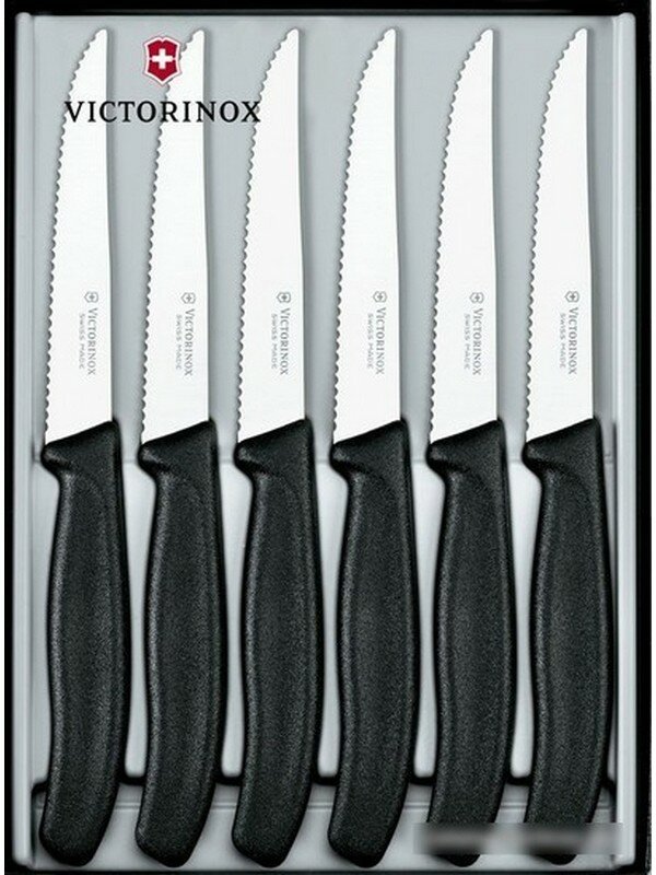 Ниже Вы можете прочитать отзывы на Набор из 6 ножей для стейков VICTORINOX Swiss Classic, лезвия 11 см из нержавеющей стали с волнистой заточкой, рукоять черного цвета (6.7233.6), ознакомится с подробными характеристиками, посмотреть интересные обзоры и фотографии на Набор из 6 ножей для стейков VICTORINOX Swiss Classic, лезвия 11 см из нержавеющей стали с волнистой заточкой, рукоять черного цвета (6.7233.6).