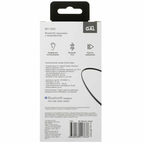 Bluetooth наушники вкладыши с микрофоном GAL BH-1005 беспроводная мобильная гарнитура, черные
