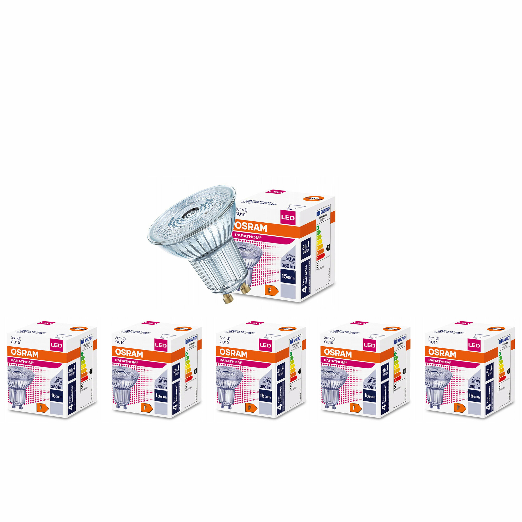 5 шт/уп. Лампа LED Софит 4.3W 220-240V GU10 PAR16 350Лм 3000К Угол 36 град. D-50mm L-52mm Свет Теплый белый OSRAM, уп. 5шт