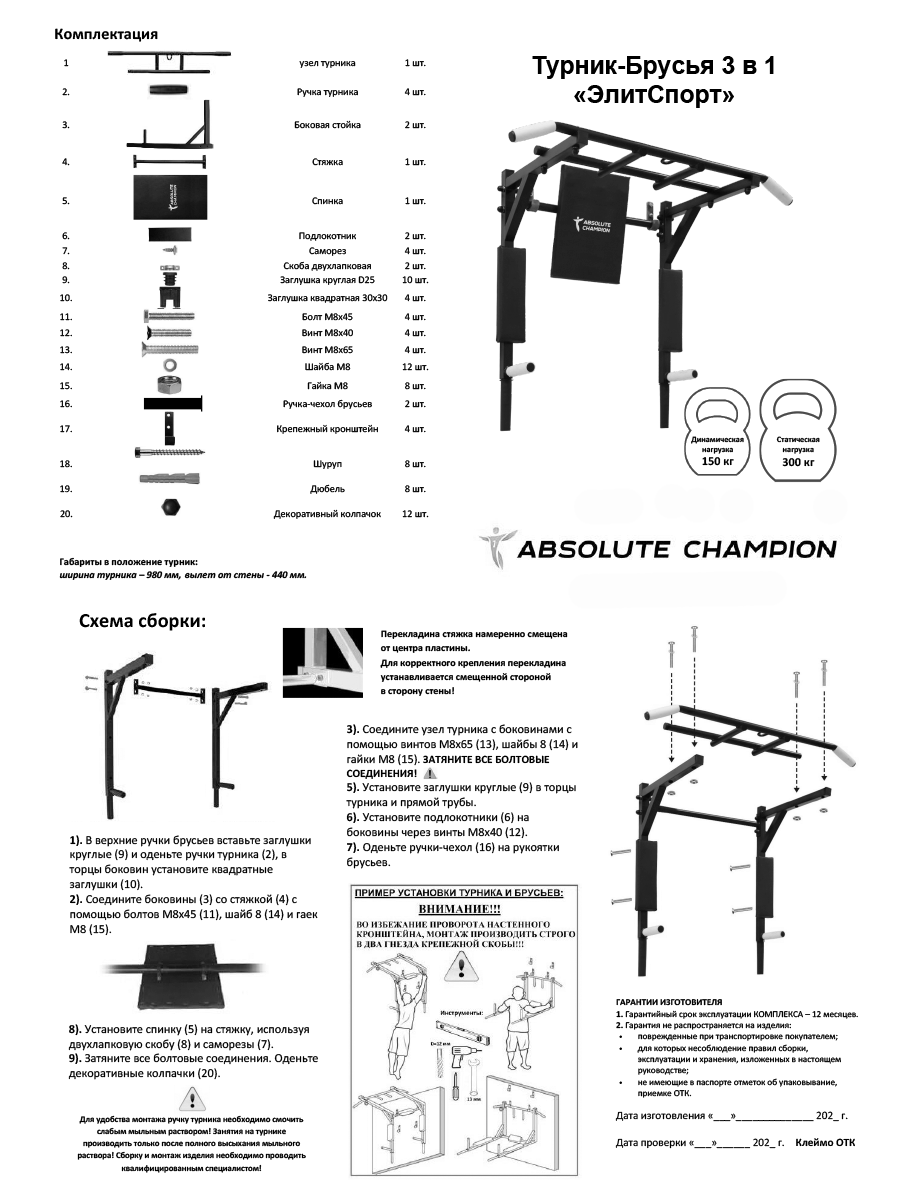| Тип | 3в1: турник / брусья / пресс |